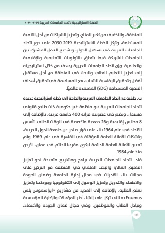 %u0627%u0644%u062e%u0637%u0629 %u0627%u0627%u0644%u0633%u0631%u062a%u0627%u062a%u064a%u062c%u064a%u0629 %u0627%u0644%u062a%u062d%u0627%u062f %u0627%u0644%u062c%u0627%u0645%u0639%u0627%u062a %u0627%u0644%u0639%u0631%u0628%u064a%u0629 2019 -203010%u0627%u0645%u0644%u0646%u0637%u0642%u0629%u060c %u0648%u0627%u0644%u062a%u062e%u0641%u064a%u0641 %u0645%u0646 %u062a%u063a%u0631%u064a %u0627%u0645%u0644%u0646%u0627%u062e%u060c %u0648%u062a%u0639%u0632%u064a%u0632 %u0627%u0644%u0631%u0634%u0627%u0643%u0627%u062a %u0645%u0646 %u0623%u062c%u0644 %u0627%u0644%u062a%u0646%u0645%u064a%u0629 %u0627%u0645%u0644%u0633%u062a%u062f%u0627%u0645%u0629%u060c %u0648%u062a%u0631%u0643%u0632 %u0627%u0644%u062e%u0637%u0629 %u0627%u0627%u0644%u0633%u0631%u062a%u0627%u062a%u064a%u062c%u064a%u0629 2019-2030 %u0639%u0649%u0644 %u062f%u0648%u0631 %u0627%u062a%u062d%u0627%u062f %u0627%u0644%u062c%u0627%u0645%u0639%u0627%u062a %u0627%u0644%u0639%u0631%u0628%u064a%u0629 %u064a%u0641 %u062a%u0633%u0647%u064a%u0644 %u0627%u0644%u062d%u0648%u0627%u0631%u060c %u0648%u062a%u0634%u062c%u064a%u0639 %u0627%u0644%u0639%u0645%u0644 %u0627%u0645%u0644%u0634%u0631%u062a%u0643 %u0628%u0646%u064a %u0627%u0644%u062c%u0627%u0645%u0639%u0627%u062a %u0627%u0644%u0631%u0634%u064a%u0643%u0629 %u0641%u064a%u0627%u0645 %u064a%u062a%u0639%u0644%u0642 %u0628%u0627%u0623%u0644%u0648%u0644%u0648%u064a%u0627%u062a %u0627%u0644%u062a%u0639%u0644%u064a%u0645%u064a%u0629 %u0648%u0627%u0625%u0644%u0642%u0644%u064a%u0645%u064a%u0629 %u0648%u0627%u0644%u0639%u0627%u0645%u0644%u064a%u0629. %u0648%u0625%u0646 %u0627%u062a%u062d%u0627%u062f %u0627%u0644%u062c%u0627%u0645%u0639%u0627%u062a %u0627%u0644%u0639%u0631%u0628%u064a%u0629 %u064a%u0647%u062f%u0641 %u0645%u0646 %u062e%u0627%u0644%u0644 %u0627%u0633%u0631%u062a%u0627%u062a%u064a%u062c%u064a%u062a%u0647 %u0625%u0649%u0644 %u062a%u0639%u0632%u064a%u0632 %u0627%u0644%u062a%u0639%u0644%u064a%u0645 %u0627%u0644%u0639%u0627%u064a%u0644 %u0648%u0627%u0644%u0628%u062d%u062b %u064a%u0641 %u0627%u0645%u0644%u0646%u0637%u0642%u0629 %u0645%u0646 %u0623%u062c%u0644 %u0645%u0633%u062a%u0642%u0628%u0644 %u0623%u0641%u0636%u0644 %u0648%u062a%u062d%u0642%u064a%u0642 %u0627%u0644%u0631%u0641%u0627%u0647%u064a%u0629 %u0644%u0644%u0634%u0628%u0627%u0628%u060c %u0645%u0639 %u0627%u0645%u0644%u0633%u0627%u0647%u0645%u0629 %u064a%u0641 %u062a%u062d%u0642%u064a%u0642 %u0623%u0647%u062f%u0627%u0641 %u064b%u0627.%u0627%u0644%u062a%u0646%u0645%u064a%u0629 %u0627%u0645%u0644%u0633%u062a%u062f%u0627%u0645%u0629 )SDG )%u0627%u0645%u0644%u0639%u062a%u0645%u062f%u0629 %u0639%u0627%u0645%u0644%u064a%u0628. %u062e%u0644%u0641%u064a%u0629 %u0639%u0646 %u0627%u062a%u062d%u0627%u062f %u0627%u0644%u062c%u0627%u0645%u0639%u0627%u062a %u0627%u0644%u0639%u0631%u0628%u064a%u0629 %u0648%u0627%u0644%u062d%u0627%u062c%u0629 %u0627%u0649%u0644 %u062e%u0637%u0629 %u0627%u0633%u0631%u062a%u0627%u062a%u064a%u062c%u064a%u0629 %u062c%u062f%u064a%u062f%u0629 %u0627%u062a%u062d%u0627%u062f %u0627%u0644%u062c%u0627%u0645%u0639%u0627%u062a %u0627%u0644%u0639%u0631%u0628%u064a%u0629 %u0647%u0648 %u0645%u0646%u0638%u0645%u0629 %u063a%u0631%u064a %u062d%u0643%u0648%u0645%u064a%u0629 %u0630%u0627%u062a %u0637%u0627%u0628%u0639 %u0642%u0627%u0646%u0648%u064a%u0646 %u0645%u0633%u062a%u0642%u0644%u060c %u0648%u064a%u0636%u0645 %u064a%u0641 %u0639%u0636%u0648%u064a%u062a%u0647 %u0642%u0631%u0627%u0628%u0629 400 %u062c%u0627%u0645%u0639%u0629 %u0639%u0631%u0628%u064a%u0629%u060c %u0628%u0627%u0625%u0644%u0636%u0627%u0641%u0629 %u0625%u0649%u0644 8 %u0645%u062c%u0627%u0644%u0633 %u0625%u0642%u0644%u064a%u0645%u064a%u0629 %u064826 %u062c%u0645%u0639%u064a%u0629 %u0645%u062a%u062e%u0635%u0635%u0629 %u064a%u0641 %u0627%u0644%u0648%u0642%u062a %u0627%u0644%u062d%u0627%u064a%u0644. %u062a%u0623%u0633%u0633 %u0627%u0627%u0644%u062a%u062d%u0627%u062f %u064a%u0641 %u0639%u0627%u0645 1964 %u0628%u0646%u0627%u0621 %u0639%u0649%u0644 %u0642%u0631%u0627%u0631 %u0635%u0627%u062f%u0631 %u0639%u0646 %u062c%u0627%u0645%u0639%u0629 %u0627%u0644%u062f%u0648%u0644 %u0627%u0644%u0639%u0631%u0628%u064a%u0629%u060c %u0648%u062a%u0634%u0643%u0644%u062a %u0627%u0623%u0644%u0645%u0627%u0646%u0629 %u0627%u0644%u0639%u0627%u0645%u0629 %u0627%u0645%u0644%u0624%u0642%u062a%u0629 %u064a%u0641 %u0627%u0644%u0642%u0627%u0647%u0631%u0629 %u064a%u0641 %u0639%u0627%u0645 1969 .%u0648%u062a%u0645 %u062a%u0639%u064a%u0646%u064a %u0627%u0623%u0644%u0645%u0627%u0646%u0629 %u0627%u0644%u0639%u0627%u0645%u0629 %u0627%u0644%u062f%u0627%u0645%u0626%u0629 %u0644%u064a%u0643%u0648%u0646 %u0645%u0642%u0631%u0647%u0627 %u0627%u0644%u062f%u0627%u0626%u0645 %u064a%u0641 %u0639%u0627%u0645%u0646%u060c %u0627%u0623%u0644%u0631%u062f%u0646 %u0645%u0646%u0630 %u0639%u0627%u0645 1984.%u0642%u0627%u062f %u0627%u062a%u062d%u0627%u062f %u0627%u0644%u062c%u0627%u0645%u0639%u0627%u062a %u0627%u0644%u0639%u0631%u0628%u064a%u0629 %u0628%u0631%u0627%u0645%u062c %u0648%u0645%u0634%u0627%u0631%u064a%u0639 %u0645%u062a%u0639%u062f%u062f%u0629 %u0646%u062d%u0648 %u062a%u0639%u0632%u064a%u0632 %u0627%u0644%u062a%u0639%u0644%u064a%u0645 %u0627%u0644%u0639%u0627%u064a%u0644 %u0648%u0627%u0644%u0628%u062d%u062b %u0627%u0644%u0639%u0644%u0645%u064a %u064a%u0641 %u0627%u0645%u0644%u0646%u0637%u0642%u0629 %u0645%u0639 %u0627%u0644%u0631%u062a%u0643%u064a%u0632 %u0639%u0649%u0644 %u0645%u062c%u0627%u0627%u0644%u062a %u0628%u0646%u0627%u0621 %u0627%u0644%u0642%u062f%u0631%u0627%u062a %u064a%u0641 %u0645%u062c%u0627%u0644 %u0625%u062f%u0627%u0631%u0629 %u0627%u0644%u062c%u0627%u0645%u0639%u0629 %u0648%u0636%u0627%u0645%u0646 %u0627%u0644%u062c%u0648%u062f%u0629 %u0648%u0627%u0627%u0644%u0639%u062a%u0627%u0645%u062f %u0648%u0627%u0644%u062a%u062f%u0648%u064a%u0644 %u0648%u062a%u0639%u0632%u064a%u0632 %u0627%u0644%u0648%u0635%u0648%u0644 %u0625%u0649%u0644 %u0627%u0644%u062a%u0643%u0646%u0648%u0644%u0648%u062c%u064a%u0627 %u0648%u062c%u0648%u062f%u062a%u0647%u0627 %u0648%u062a%u0639%u0632%u064a%u0632 %u062a%u0639%u0644%u0645 %u0627%u0644%u