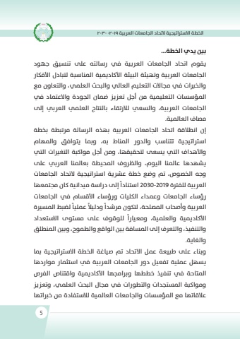 %u0627%u0644%u062e%u0637%u0629 %u0627%u0627%u0644%u0633%u0631%u062a%u0627%u062a%u064a%u062c%u064a%u0629 %u0627%u0644%u062a%u062d%u0627%u062f %u0627%u0644%u062c%u0627%u0645%u0639%u0627%u062a %u0627%u0644%u0639%u0631%u0628%u064a%u0629 2019 -20305%u0628%u0646%u064a %u064a%u062f%u064a %u0627%u0644%u062e%u0637%u0629... %u064a%u0642%u0648%u0645 %u0627%u062a%u062d%u0627%u062f %u0627%u0644%u062c%u0627%u0645%u0639%u0627%u062a %u0627%u0644%u0639%u0631%u0628%u064a%u0629 %u064a%u0641 %u0631%u0633%u0627%u0644%u062a%u0647 %u0639%u0649%u0644 %u062a%u0646%u0633%u064a%u0642 %u062c%u0647%u0648%u062f %u0627%u0644%u062c%u0627%u0645%u0639%u0627%u062a %u0627%u0644%u0639%u0631%u0628%u064a%u0629 %u0648%u062a%u0647%u064a%u0626%u0629 %u0627%u0644%u0628%u064a%u0626%u0629 %u0627%u0623%u0644%u0643%u0627%u062f%u0645%u064a%u064a%u0629 %u0627%u0645%u0644%u0646%u0627%u0633%u0628%u0629 %u0644%u062a%u0628%u0627%u062f%u0644 %u0627%u0623%u0644%u0641%u0643%u0627%u0631 %u0648%u0627%u0644%u062e%u0631%u0628%u0627%u062a %u064a%u0641 %u0645%u062c%u0627%u0627%u0644%u062a %u0627%u0644%u062a%u0639%u0644%u064a%u0645 %u0627%u0644%u0639%u0627%u064a%u0644 %u0648%u0627%u0644%u0628%u062d%u062b %u0627%u0644%u0639%u0644%u0645%u064a%u060c %u0648%u0627%u0644%u062a%u0639%u0627%u0648%u0646 %u0645%u0639 %u0627%u0645%u0644%u0624%u0633%u0633%u0627%u062a %u0627%u0644%u062a%u0639%u0644%u064a%u0645%u064a%u0629 %u0645%u0646 %u0623%u062c%u0644 %u062a%u0639%u0632%u064a%u0632 %u0636%u0627%u0645%u0646 %u0627%u0644%u062c%u0648%u062f%u0629 %u0648%u0627%u0627%u0644%u0639%u062a%u0627%u0645%u062f %u064a%u0641 %u0627%u0644%u062c%u0627%u0645%u0639%u0627%u062a %u0627%u0644%u0639%u0631%u0628%u064a%u0629%u060c %u0648%u0627%u0644%u0633%u0639%u064a %u0644%u0627%u0644%u0631%u062a%u0642%u0627%u0621 %u0628%u0627%u0644%u0646%u062a%u0627%u062c %u0627%u0644%u0639%u0644%u0645%u064a %u0627%u0644%u0639%u0631%u064a%u0628 %u0625%u0649%u0644 %u0645%u0635%u0627%u0641 %u0627%u0644%u0639%u0627%u0645%u0644%u064a%u0629.%u0625%u0646 %u0627%u0646%u0637%u0627%u0644%u0642%u0629 %u0627%u062a%u062d%u0627%u062f %u0627%u0644%u062c%u0627%u0645%u0639%u0627%u062a %u0627%u0644%u0639%u0631%u0628%u064a%u0629 %u0628%u0647%u0630%u0647 %u0627%u0644%u0631%u0633%u0627%u0644%u0629 %u0645%u0631%u062a%u0628%u0637%u0629 %u0628%u062e%u0637%u0629 %u0627%u0633%u0631%u062a%u0627%u062a%u064a%u062c%u064a%u0629 %u062a%u062a%u0646%u0627%u0633%u0628 %u0648%u0627%u0644%u062f%u0648%u0631 %u0627%u0645%u0644%u0646%u0627%u0637 %u0628%u0647%u060c %u0648%u0645%u0628%u0627 %u064a%u062a%u0648%u0627%u0641%u0642 %u0648%u0627%u0645%u0644%u0647%u0627%u0645 %u0648%u0627%u0623%u0644%u0647%u062f%u0627%u0641 %u0627%u0644%u062a%u064a %u064a%u0633%u0639%u0649 %u0644%u062a%u062d%u0642%u064a%u0642%u0647%u0627%u060c %u0648%u0645%u0646 %u0623%u062c%u0644 %u0645%u0648%u0627%u0643%u0628%u0629 %u0627%u0644%u062a%u063a%u0631%u064a%u0627%u062a %u0627%u0644%u062a%u064a %u064a%u0634%u0647%u062f%u0647%u0627 %u0639%u0627%u0645%u0644%u0646%u0627 %u0627%u0644%u064a%u0648%u0645%u060c %u0648%u0627%u0644%u0638%u0631%u0648%u0641 %u0627%u0645%u0644%u062d%u064a%u0637%u0629 %u0628%u0639%u0627%u0645%u0644%u0646%u0627 %u0627%u0644%u0639%u0631%u064a%u0628 %u0639%u0649%u0644 %u0648%u062c%u0647 %u0627%u0644%u062e%u0635%u0648%u0635%u060c %u062a%u0645 %u0648%u0636%u0639 %u062e%u0637%u0629 %u0639%u0631%u0634%u064a%u0629 %u0627%u0633%u0631%u062a%u0627%u062a%u064a%u062c%u064a%u0629 %u0627%u0644%u062a%u062d%u0627%u062f %u0627%u0644%u062c%u0627%u0645%u0639%u0627%u062a %u0627%u0644%u0639%u0631%u0628%u064a%u0629 %u0644%u0644%u0641%u0631%u062a%u0629 2019-2030 %u0627%u0633%u062a%u0646%u0627%u062f%u0627%u064b %u0625%u0649%u0644 %u062f%u0631%u0627%u0633%u0629 %u0645%u064a%u062f%u0627%u0646%u064a%u0629 %u0643%u0627%u0646 %u0645%u062c%u062a%u0645%u0639%u0647%u0627 %u0631%u0624%u0633%u0627%u0621 %u0627%u0644%u062c%u0627%u0645%u0639%u0627%u062a %u0648%u0639%u0645%u062f%u0627%u0621 %u0627%u0644%u0643%u0644%u064a%u0627%u062a %u0648%u0631%u0624%u0633%u0627%u0621 %u0627%u0623%u0644%u0642%u0633%u0627%u0645 %u064a%u0641 %u0627%u0644%u062c%u0627%u0645%u0639%u0627%u062a %u0627%u0644%u0639%u0631%u0628%u064a%u0629 %u0648%u0623%u0635%u062d%u0627%u0628 %u0627%u0645%u0644%u0635%u0644%u062d%u0629%u060c %u0644%u062a%u0643%u0648%u0646 %u0645%u0631%u0634%u062f%u0627%u064b %u0648%u062f%u0644%u064a%u0627%u0644%u064b %u0639%u0645%u0644%u064a%u0627%u064b %u0644%u0636%u0628%u0637 %u0627%u0645%u0644%u0633%u0631%u064a%u0629 %u0627%u0623%u0644%u0643%u0627%u062f%u0645%u064a%u064a%u0629 %u0648%u0627%u0644%u0639%u0644%u0645%u064a%u0629%u060c %u0648%u0645%u0639%u064a%u0627%u0631%u0627%u064b %u0644%u0644%u0648%u0642%u0648%u0641 %u0639%u0649%u0644 %u0645%u0633%u062a%u0648%u0649 %u0627%u0627%u0644%u0633%u062a%u0639%u062f%u0627%u062f %u0648%u0627%u0644%u062a%u0646%u0641%u064a%u0630%u060c %u0648%u0627%u0644%u062a%u0639%u0631%u0641 %u0625%u0649%u0644 %u0627%u0645%u0644%u0633%u0627%u0641%u0629 %u0628%u0646%u064a %u0627%u0644%u0648%u0627%u0642%u0639 %u0648%u0627%u0644%u0637%u0645%u0648%u062d%u060c %u0648%u0628%u0646%u064a %u0627%u0645%u0644%u0646%u0637%u0644%u0642 %u0648%u0627%u0644%u063a%u0627%u064a%u0629.%u0648%u0628%u0646%u0627%u0621 %u0639%u0649%u0644 %u0637%u0628%u064a%u0639%u0629 %u0639%u0645%u0644 %u0627%u0627%u0644%u062a%u062d%u0627%u062f %u062a%u0645 %u0635%u064a%u0627%u063a%u0629 %u0627%u0644%u062e%u0637%u0629 %u0627%u0627%u0644%u0633%u0631%u062a%u0627%u062a%u064a%u062c%u064a%u0629 %u0645%u0628%u0627 %u064a%u0633%u0647%u0644 %u0639%u0645%u0644%u064a%u0629 %u062a%u0641%u0639%u064a%u0644 %u062f%u0648%u0631 %u0627%u0644%u062c%u0627%u0645%u0639%u0627%u062a %u0627%u0644%u0639%u0631%u0628%u064a%u0629 %u064a%u0641 %u0627%u0633%u062a%u062b%u0627%u0645%u0631 %u0645%u0648%u0627%u0631%u062f%u0647%u0627 %u0627%u0645%u0644%u062a%u0627%u062d%u0629 %u064a%u0641 %u062a%u0646%u0641%u064a%u0630 %u062e%u0637%u0637%u0647%u0627 %u0648%u0628%u0631%u0627%u0645%u062c%u0647%u0627 %u0627%u0623%u0644%u0643%u0627%u062f%u0645%u064a%u064a%u0629 %u0648%u0627%u0642%u062a%u0646%u0627%u0635 %u0627%u0644%u0641%u0631%u0635 %u0648%u0645%u0