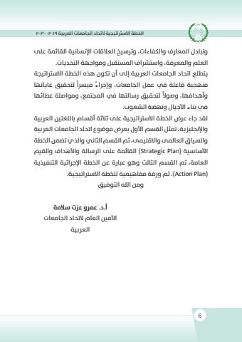 %u0627%u0644%u062e%u0637%u0629 %u0627%u0627%u0644%u0633%u0631%u062a%u0627%u062a%u064a%u062c%u064a%u0629 %u0627%u0644%u062a%u062d%u0627%u062f %u0627%u0644%u062c%u0627%u0645%u0639%u0627%u062a %u0627%u0644%u0639%u0631%u0628%u064a%u0629 2019 -20306%u0648%u062a%u0628%u0627%u062f%u0644 %u0627%u0645%u0644%u0639%u0627%u0631%u0641 %u0648%u0627%u0644%u0643%u0641%u0627%u0621%u0627%u062a%u060c %u0648%u062a%u0631%u0633%u064a%u062e %u0627%u0644%u0639%u0627%u0644%u0642%u0627%u062a %u0627%u0625%u0644%u0646%u0633%u0627%u0646%u064a%u0629 %u0627%u0644%u0642%u0627%u0645%u0626%u0629 %u0639%u0649%u0644 %u0627%u0644%u0639%u0644%u0645 %u0648%u0627%u0645%u0644%u0639%u0631%u0641%u0629%u060c %u0648%u0627%u0633%u062a%u0631%u0634%u0627%u0641 %u0627%u0645%u0644%u0633%u062a%u0642%u0628%u0644 %u0648%u0645%u0648%u0627%u062c%u0647%u0629 %u0627%u0644%u062a%u062d%u062f%u064a%u0627%u062a.%u064a%u062a%u0637%u0644%u0639 %u0627%u062a%u062d%u0627%u062f %u0627%u0644%u062c%u0627%u0645%u0639%u0627%u062a %u0627%u0644%u0639%u0631%u0628%u064a%u0629 %u0625%u0649%u0644 %u0623%u0646 %u062a%u0643%u0648%u0646 %u0647%u0630%u0647 %u0627%u0644%u062e%u0637%u0629 %u0627%u0627%u0644%u0633%u0631%u062a%u0627%u062a%u064a%u062c%u0629 %u064b %u0645%u0646%u0647%u062c%u064a%u0629 %u0641%u0627%u0639%u0644%u0629 %u064a%u0641 %u0639%u0645%u0644 %u0627%u0644%u062c%u0627%u0645%u0639%u0627%u062a%u060c %u0648%u0625%u062c%u0631%u0627%u0621 %u0645%u064a%u0631%u0633%u0627%u064b %u0644%u062a%u062d%u0642%u064a%u0642 %u063a%u0627%u064a%u0627%u062a%u0647%u0627 %u0648%u0623%u0647%u062f%u0627%u0641%u0647%u0627%u060c %u0648%u0635%u0648%u0627%u0644%u064b %u0644%u062a%u062d%u0642%u064a%u0642 %u0631%u0633%u0627%u0644%u062a%u0647%u0627 %u064a%u0641 %u0627%u0645%u0644%u062c%u062a%u0645%u0639%u060c %u0648%u0645%u0648%u0627%u0635%u0644%u0629 %u0639%u0637%u0627%u0626%u0647%u0627 %u064a%u0641 %u0628%u0646%u0627%u0621 %u0627%u0623%u0644%u062c%u064a%u0627%u0644 %u0648%u0646%u0647%u0636%u0629 %u0627%u0644%u0634%u0639%u0648%u0628. %u0644%u0642%u062f %u062c%u0627%u0621 %u0639%u0631%u0636 %u0627%u0644%u062e%u0637%u0629 %u0627%u0627%u0644%u0633%u0631%u062a%u0627%u062a%u064a%u062c%u064a%u0629 %u0639%u0649%u0644 %u062b%u0627%u0644%u062b%u0629 %u0623%u0642%u0633%u0627%u0645 %u0628%u0627%u0644%u0644%u063a%u062a%u0646%u064a %u0627%u0644%u0639%u0631%u0628%u064a%u0629 %u0648%u0627%u0625%u0644%u0646%u062c%u0644%u064a%u0632%u064a%u0629%u060c %u0645%u062a%u062b%u0644 %u0627%u0644%u0642%u0633%u0645 %u0627%u0623%u0644%u0648%u0644 %u0628%u0639%u0631%u0636 %u0645%u0648%u0636%u0648%u0639 %u0627%u062a%u062d%u0627%u062f %u0627%u0644%u062c%u0627%u0645%u0639%u0627%u062a %u0627%u0644%u0639%u0631%u0628%u064a%u0629 %u0648%u0627%u0644%u0633%u064a%u0627%u0642 %u0627%u0644%u0639%u0627%u0645%u0644%u0649 %u0648%u0627%u0627%u0644%u0642%u0644%u064a%u0645%u0649%u060c %u062b%u0645 %u0627%u0644%u0642%u0633%u0645 %u0627%u0644%u062b%u0627%u064a%u0646 %u0648%u0627%u0644%u0630%u064a %u062a%u0636%u0645%u0646 %u0627%u0644%u062e%u0637%u0629 %u0627%u0623%u0644%u0633%u0627%u0633%u064a%u0629 )Plan Strategic )%u0627%u0644%u0642%u0627%u0645%u0626%u0629 %u0639%u0649%u0644 %u0627%u0644%u0631%u0633%u0627%u0644%u0629 %u0648%u0627%u0623%u0644%u0647%u062f%u0627%u0641 %u0648%u0627%u0644%u0642%u064a%u0645 %u0627%u0644%u0639%u0627%u0645%u0629%u060c %u062b%u0645 %u0627%u0644%u0642%u0633%u0645 %u0627%u0644%u062b%u0627%u0644%u062b %u0648%u0647%u0648 %u0639%u0628%u0627%u0631%u0629 %u0639%u0646 %u0627%u0644%u062e%u0637%u0629 %u0627%u0625%u0644%u062c%u0631%u0627%u0626%u064a%u0629 %u0627%u0644%u062a%u0646%u0641%u064a%u0630%u064a%u0629 )Plan Action %u060c)%u062b%u0645 %u0648%u0631%u0642%u0629 %u0645%u0641%u0627%u0647%u064a%u0645%u064a%u0629 %u0644%u0644%u062e%u0637%u0629 %u0627%u0627%u0644%u0633%u0631%u062a%u0627%u062a%u064a%u062c%u064a%u0629.%u0648%u0645%u0646 %u0627%u0644%u0644%u0647 %u0627%u0644%u062a%u0648%u0641%u064a%u0642%u0623.%u062f. %u0639%u0645%u0631%u0648 %u0639%u0632%u062a %u0633%u0627%u0644%u0645%u0629%u0627%u0623%u0644%u0645%u0646%u064a %u0627%u0644%u0639%u0627%u0645 %u0627%u0644%u062a%u062d%u0627%u062f %u0627%u0644%u062c%u0627%u0645%u0639%u0627%u062a %u0627%u0644%u0639%u0631%u0628%u064a%u0629